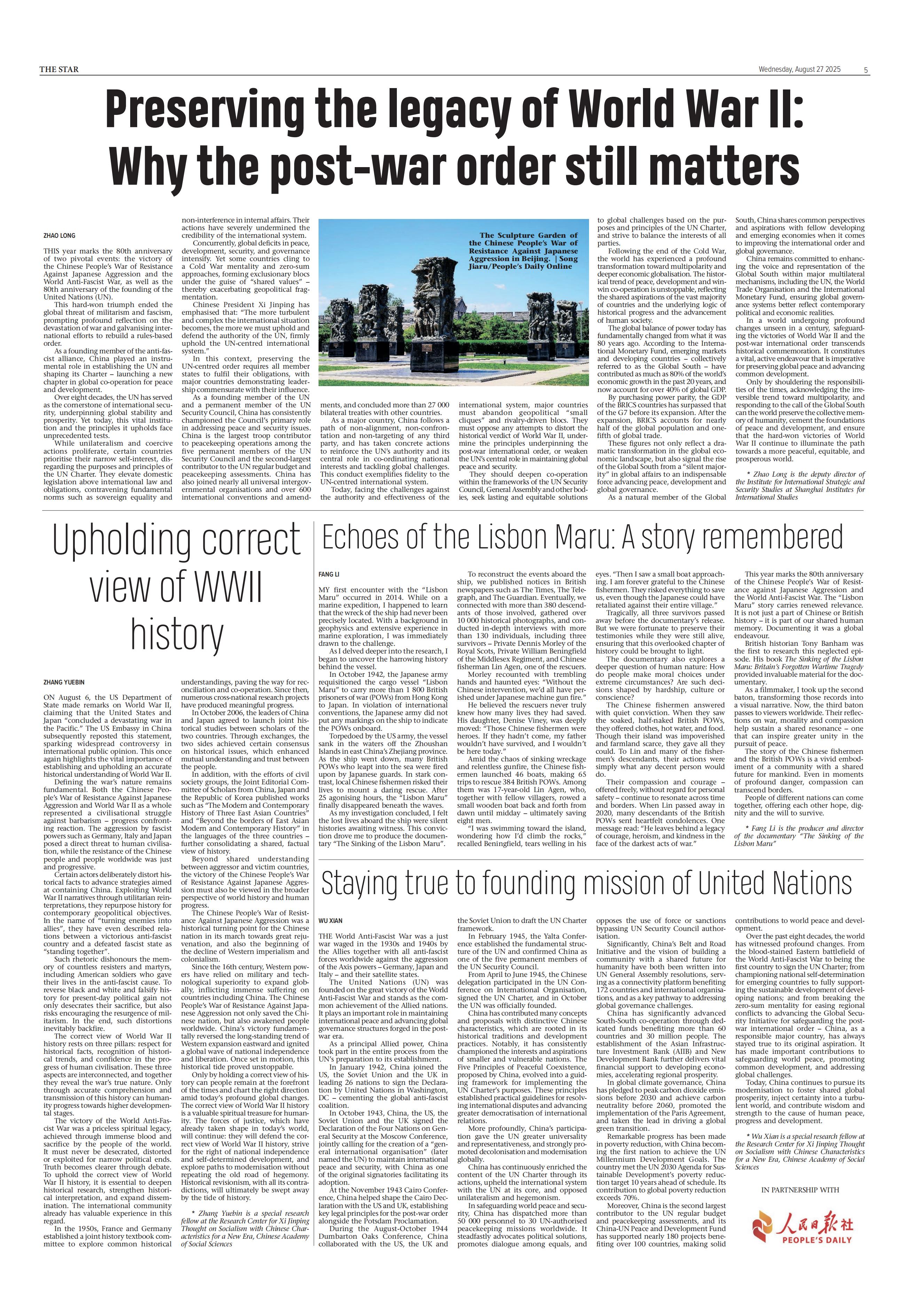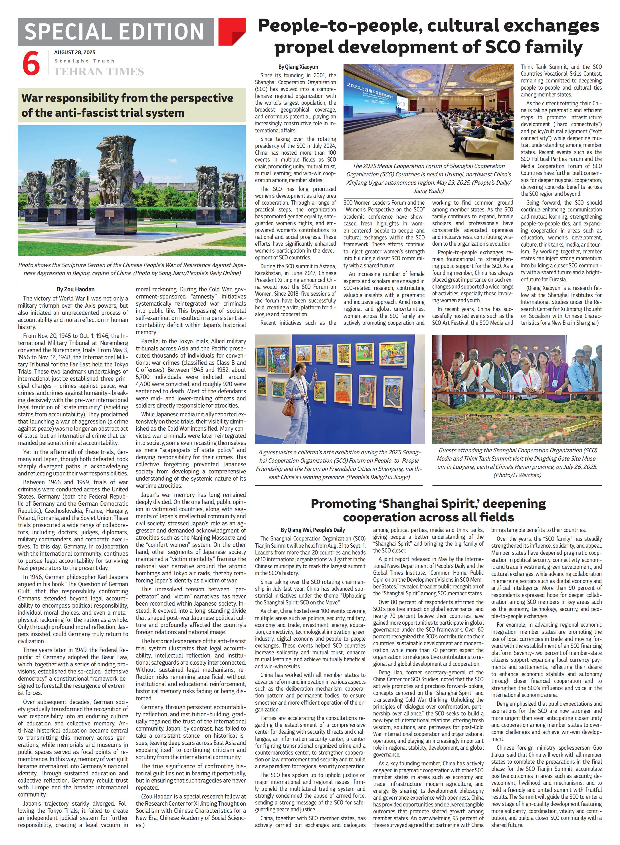 中国社科院日本研究所吴限、陈祥、邹皓丹,世界历史研究所张跃斌以及近代史研究所吴敏超等学者应《人民日报》约稿,围绕中国人民抗日战争暨世界反法西斯战争胜利80周年主题发表相关评论文章。文章经翻译成英语、法语、西语、俄语、韩语、阿拉伯语、匈牙利语等10余种语言,在西班牙、匈牙利、泰国、印度尼西亚、柬埔寨、巴基斯坦、哈萨克斯坦、韩国、南非、坦桑尼亚、塞内加尔、肯尼亚、阿曼、伊朗、科威特、伊拉克、圭亚那、墨西哥等近30个国家的近40家媒体刊发。落地媒体包括西班牙《先锋报》、匈牙利《民主主义者周刊》、泰国《经理报》、印度尼西亚《雅加达邮报》、柬埔寨《高棉时报》、巴基斯坦《国民报》、哈萨克斯坦《实业报》、韩国《韩民族日报》、南非《星报》、坦桑尼亚《卫报》、塞内加尔《南方日报》、肯尼亚《星报》、阿曼《青年报》、伊朗《德黑兰时报》、科威特《报章报》、伊拉克《时代报》、《圭亚那纪事报》、墨西哥《改革报》等。文章也在《环球时报》等媒体网站同步刊发,多家媒体在头版刊发导读,使相关报道在当地舆论场形成较强传播效应。